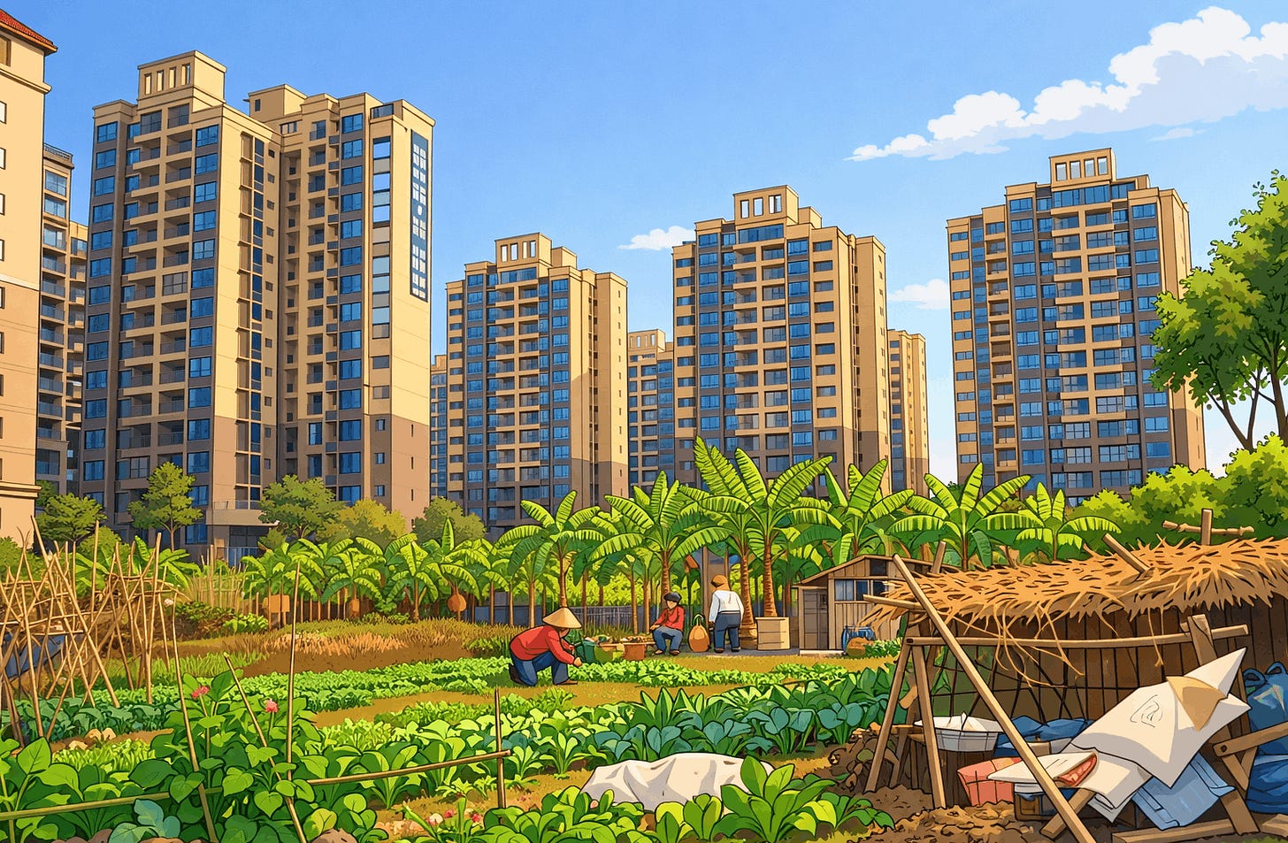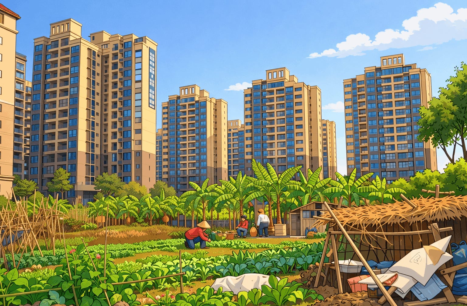 Here, in the shadows of the new developments, and under the bridge of the new metro bridge, locals farm scraps of free land. Bananas. Lettuces. Chives. Nearby, a roadside stall sells oranges at 1 yuan ($0.14) per jin.